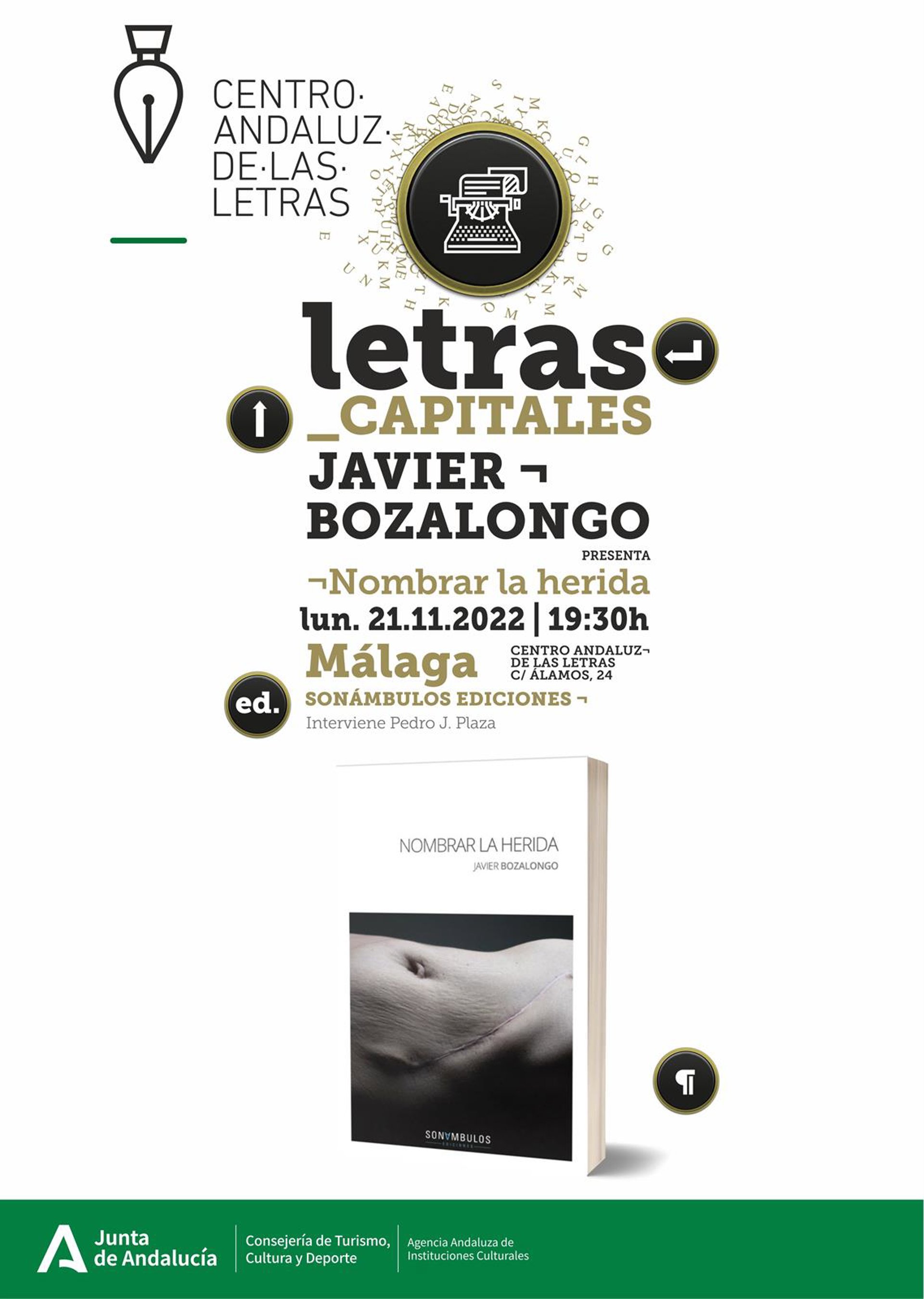 La Consejería de Turismo, Cultura y Deporte, a través de la Agencia Andaluza de Instituciones Culturales, organiza el próximo lunes, día 21, la presentación del poemario 'Nombrar la herida' de Javier Bozalongo, publicado por Sonámbulos Ediciones.