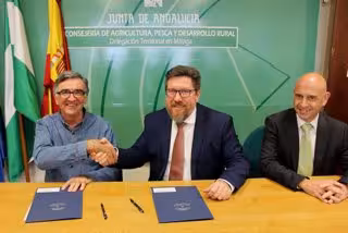 El Consejero de Agricultura, Pesca y Desarrollo Rural, Rodrigo Sánchez Haro, y el presidente de la Asociación Malagueña de Apicultores, Fernando de Miguel, han firmado este jueves un convenio de colaboración que va a permitir fomentar la comercialización de la miel producida en esta provincia a partir de la marca 'Miel de Málaga', de la que es titular la Consejería.