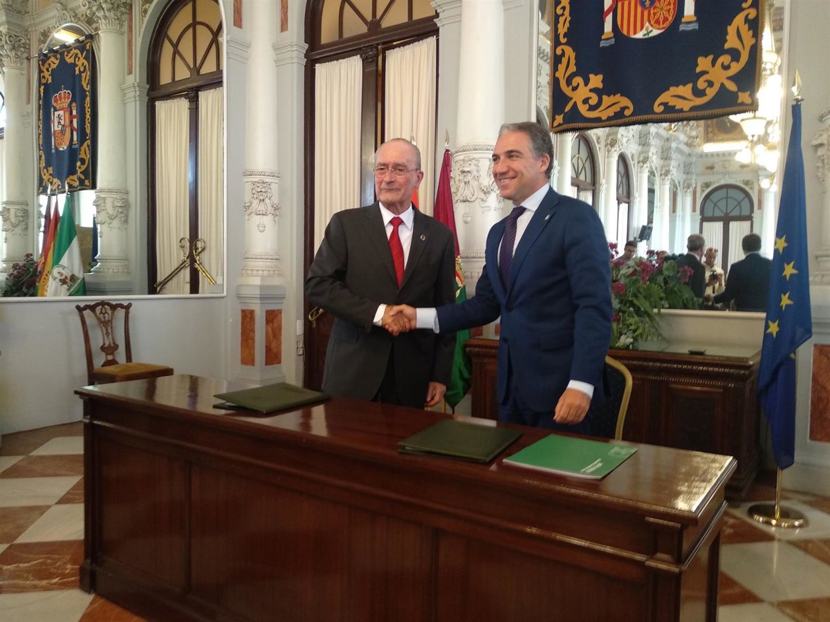 El consejero de la Presidencia, Elías Bendodo, y el alcalde de la ciudad, Francisco de la Torre, han firmado este miércoles la prórroga del servicio de televisión pública local, Canal Málaga.