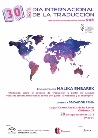 La Consejería de Cultura, a través del Centro Andaluz de las Letras y en colaboración con ACE Traductores --sección autónoma de la Asociación Colegial de Escritores de España--, celebra este viernes por quinto año consecutivo el Día Internacional de la Traducción, con una conferencia a cargo de la traductora y escritora hispano-marroquí Malika Embarek, titulada 'Reflexión sobre el proceso de traducción a partir de algunos mitos de la cultura universal: el conde don Julián, la Malinche y el andrógino'.
