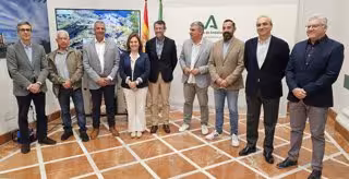 El delegado territorial junto al alcalde de Moclinejo y representante de la Mancomunidad de Municipios de la Costa del Sol oriental Axarquía, Antonio Muñoz, así como con el alcalde de Almáchar, Antonio Yuste; el representante de la Asociación Moascatel, Juan Gámez; y el secretario técnico de la Asociación Sipam, Rafael Fernández; ha informado sobre esta iniciativa patrocinada por la Consejería de Agricultura, Pesca, Agua y Desarrollo Rural "para poner en valor la uva pasa moscatel y los servicios generados a su alrededor".