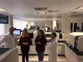 La delegada territorial de Igualdad, salud y Políticas Sociales, Ana Isabel González, acompañada por el gerente del Área Sanitaria Serranía, Manuel Bayona, y el responsable de la Unidad de Laboratorio, Francisco Javier Mérida, ha visitado estos equipos y ha destacado que el Laboratorio Clínico de este centro "es el primero de Andalucía en instalar esta tecnología y el primero de España en reportar toda la bioquímica e inmunoquímica, incluyendo rutina y urgencias, a través de este equipamiento".