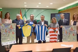 Los delegados de Gobierno e Igualdad, Salud y Políticas Sociales, José Luis Ruiz Espejo y Begoña Tundidor, respectivamente; junto al presidente de la asociación AVOI, Juan Carmona; la directora técnica del Área de Derechos Sociales del Ayuntamiento, Mar Torres, y el presidente de la Federación Malagueña de Fútbol, Miguel Sánchez, han presentado este miércoles el encuentro.