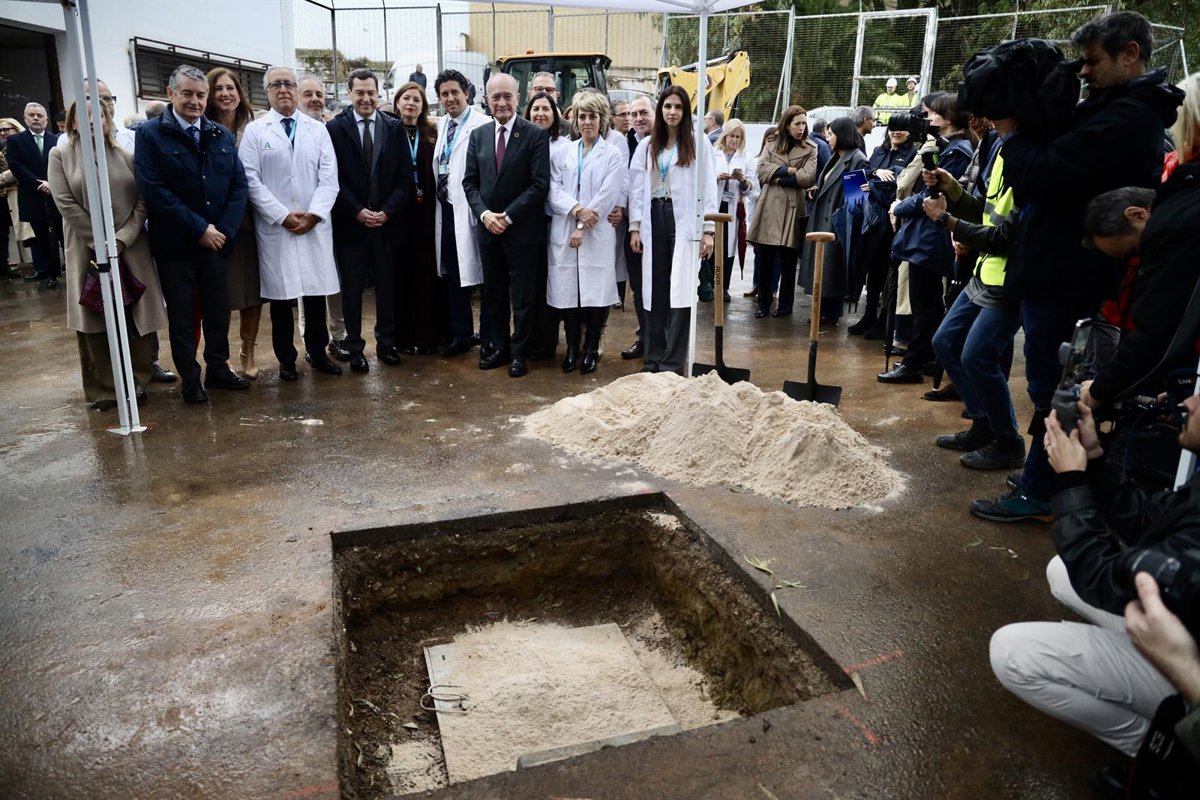 El presidente de la Junta de Andalucía, Juanma Moreno (4i), el alcalde de Málaga, Francisco de la Torre (3d), el consejero de Sanidad, Antonio Sanz (2i) en el acto de colocación de la primera piedra del nuevo Hospital Virgen de la Esperanza de Málaga. - Álex Zea - Europa Press