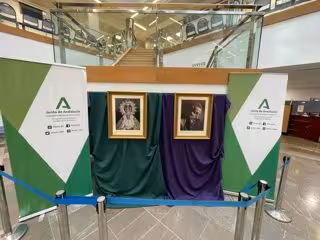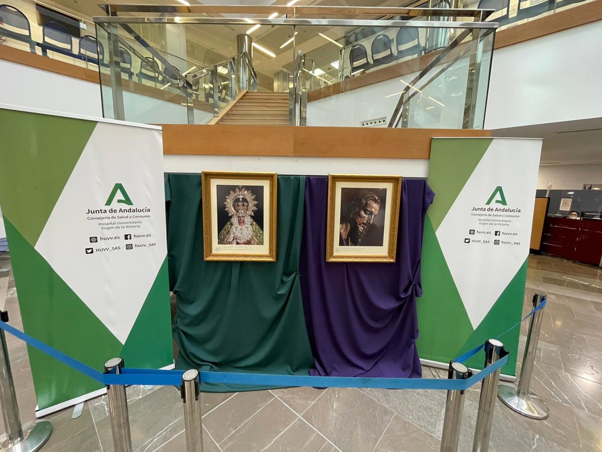Los cuadros con las imágenes de María Santísima de la Esperanza y Jesús Nazareno del Paso, presiden desde este viernes de Dolores el patio principal de consultas externas y pruebas funcionales del Hospital Clínico Universitario Virgen de la Victoria de Málaga, con motivo del hermanamiento que este centro mantiene con esta archicofradía desde el pasado año 2023 para acercar la Semana Santa a nuestros pacientes y profesionales.