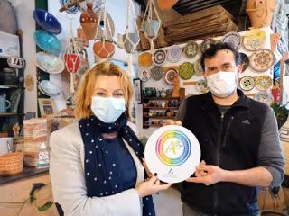 Durante la visita al taller, Pascual Cózar, ceramista artesano desde hace más de 30 años y cuarta generación de tradición alfarera, ha recogido su distintivo que colocará "a la vista" para que todo aquel que compre, según ha explicado Sánchez Sierra, "tenga garantizada la calidad y la procedencia de estos productos artesanos".
