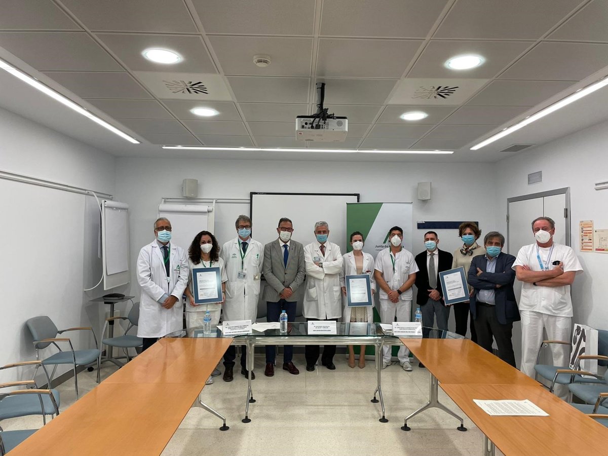 El hospital ha acogido este martes la entrega de los distintivos de calidad a los equipos responsables de los tres servicios por parte del delegado territorial de Salud y Familias en Málaga, Carlos Bautista Ojeda, y del director de la ACSA, José Ignacio del Río Maza de Lizana, que han estado acompañados por el director gerente del Hospital Universitario Virgen de la Victoria, José Antonio Ortega Domínguez, y su equipo directivo.