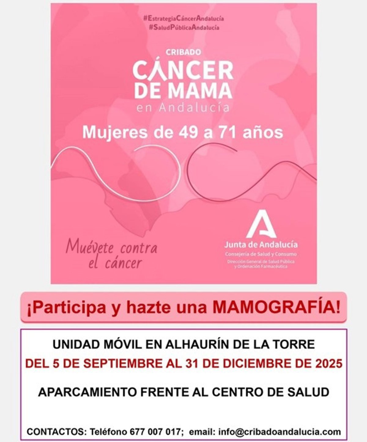 La Unidad Móvil del Programa de Diagnóstico Precoz de Cáncer de Mama continúa con su recorrido por los municipios del Distrito malagueño de Valle del Guadalhorce para mejorar la accesibilidad de las mujeres residentes en estas poblaciones que se encuentran alejadas de las unidades fijas y en esta ocasión se traslada a Alhaurín de la Torre.