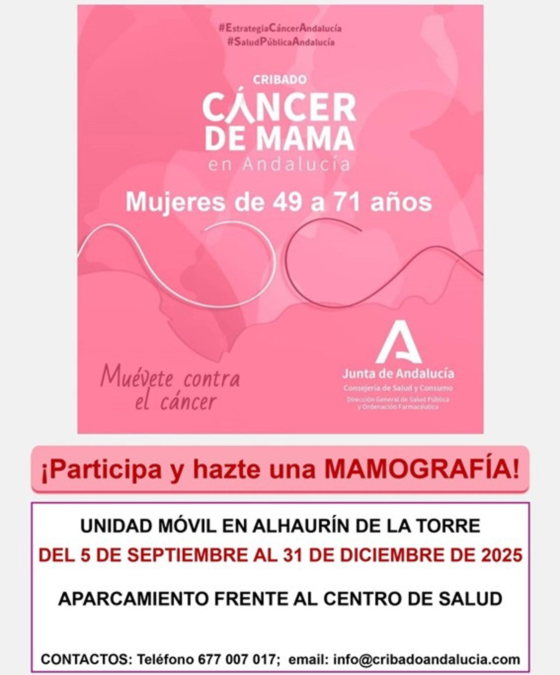 En dicha localidad permanecerá ubicada en el aparcamiento situado frente al centro de salud, desde el próximo 5 de septiembre hasta el final del presente año, según han informado desde el Gobierno andaluz en una nota, en la que animan a las mujeres con edades comprendidas entre 49 y 71 años, residentes en esta localidad, a que comprueben que han recibido su cita y que participen.
