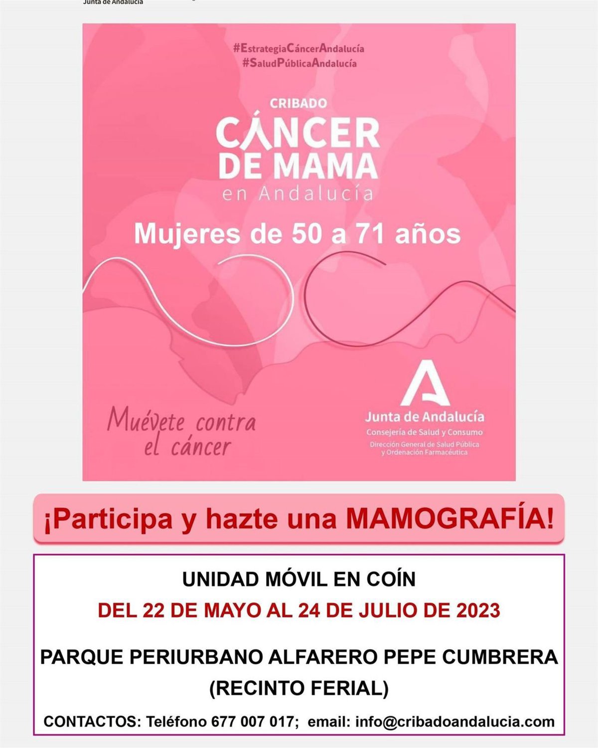 El próximo día 24 de julio finalizará la campaña de detección precoz de cáncer de mama de la Zona Básica de Coín (Málaga). Se trata de una campaña que se inició el 22 de mayo y para la que se ha contado con una unidad móvil situada en el Parque Periurbano Alfarero Pepe Cumbrera, en la zona del recinto ferial.