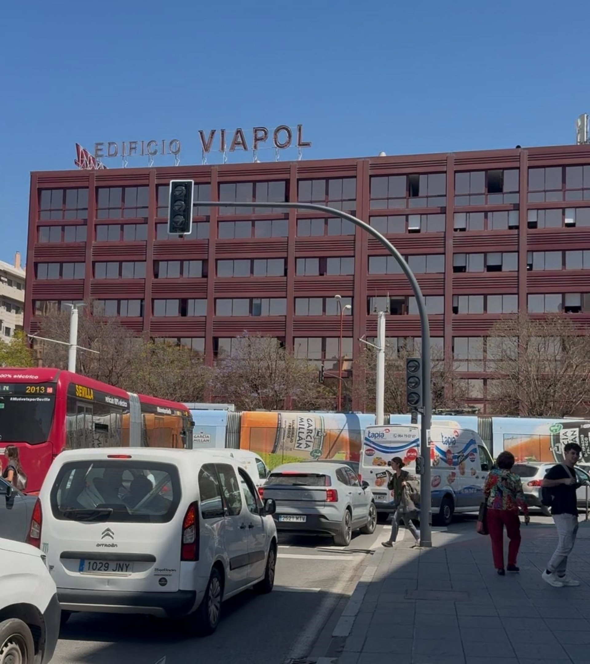 Imagen de este lunes del tranvía en Sevilla detenido impidiendo el tráfico rodado tras el apagón. - EUROPA PRESS