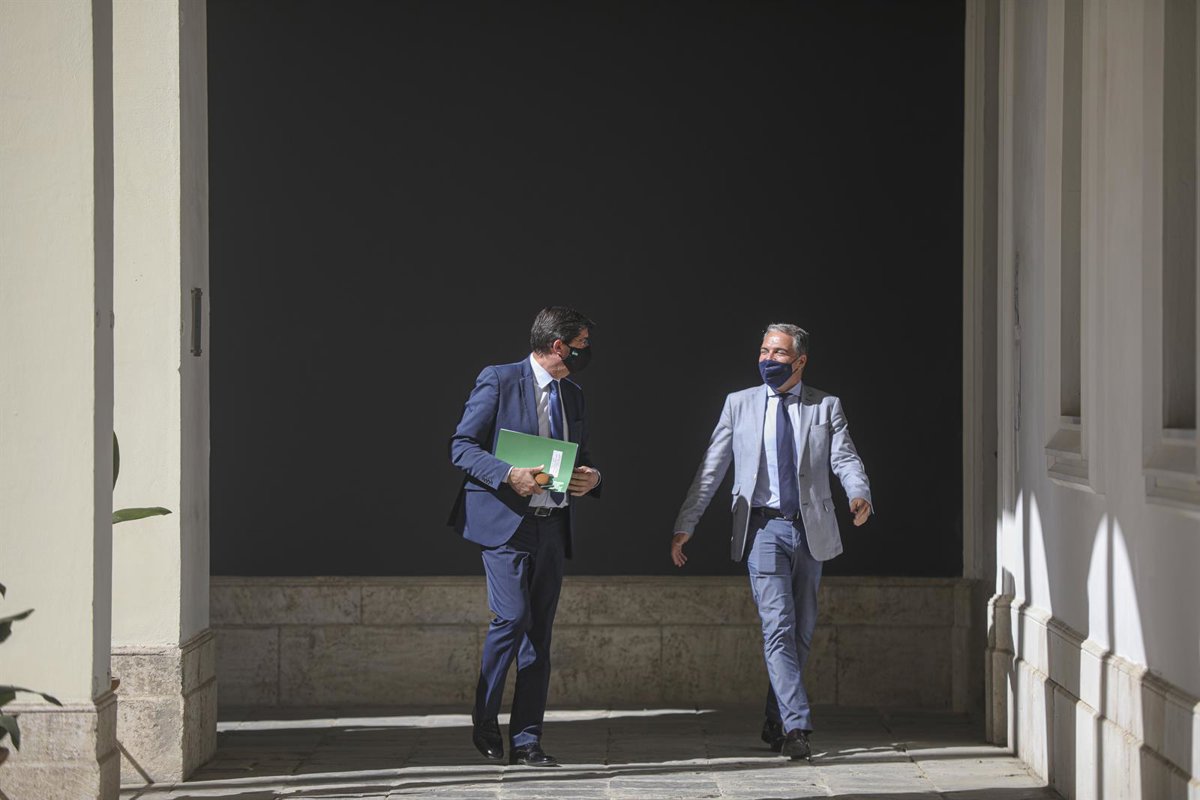 El vicepresidente de la Junta de Andalucía, Juan Marín (i), junto al consejero de Presidencia, Elias Bendodo (d), a su llegada a la rueda de prensa posterior a la reunión del Consejo de Gobierno de la Junta de Andalucía. En Sevilla, a 13 de octubre de 2 - María José López - Europa Press