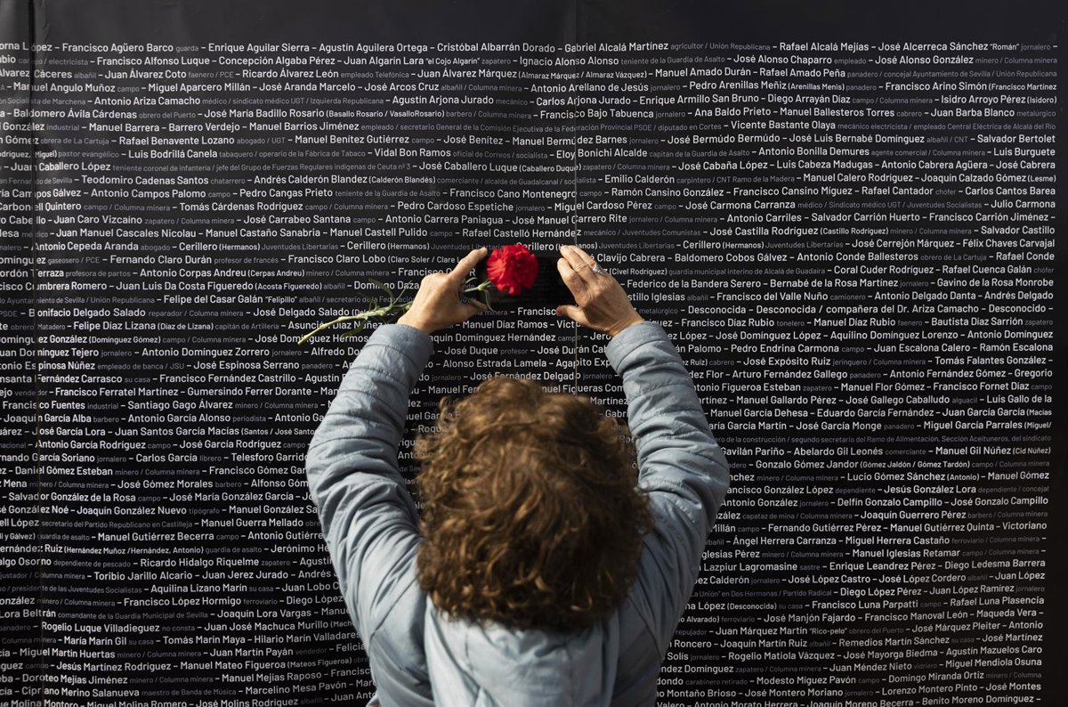 Archivo - Una mujer hace una foto del nombre de su familiar, colocado en un panel junto a los de las demás víctimas, durante el acto "institucional" de cierre de la fosa de Pico Reja. A 21 de febrero de 2023, en Sevilla (Andalucía, España). (Foto de archi - María José López - Europa Press - Archivo