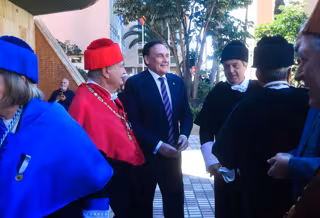 El consejero de Universidad, Investigación e Innovación José Carlos Gómez Villamandos (c) junto al nuevo rector de la UMA, Teodomiro López (2d) antes del comienzo del acto de investirura, a 6 de marzo de 2024, en Málaga. (Foto de archivo). - Álex Zea - Europa Press
