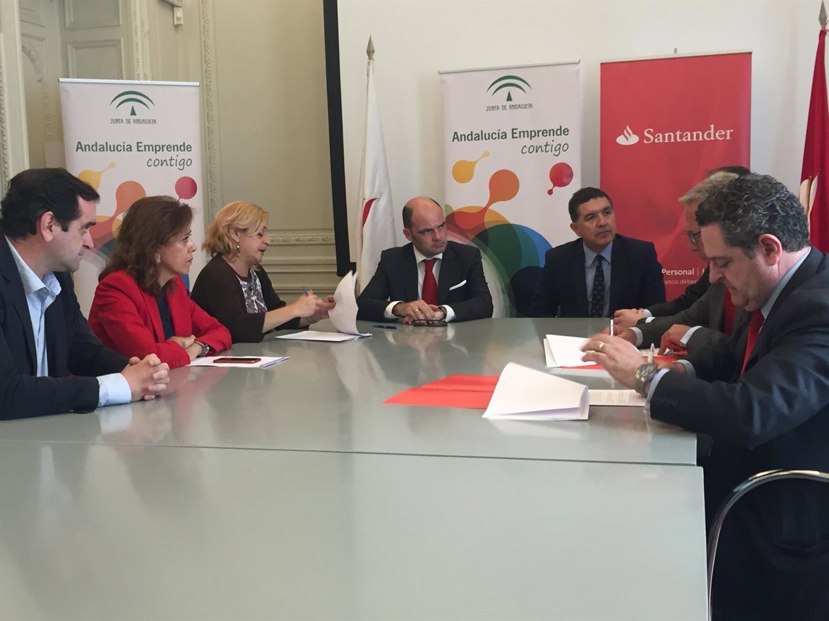 El secretario general de Economía y presidente de Andalucía Emprende, Gaspar Llanes, y el director territorial del Banco Santander en Andalucía, Justiniano Cortés, han presidido la firma de un convenio entre Andalucía Emprende, fundación pública dependiente de la Consejería de Economía y Conocimiento, y la entidad financiera que regulará la colaboración entre ambas entidades para desarrollar conjuntamente iniciativas de financiación que impulsen el emprendimiento andaluz.