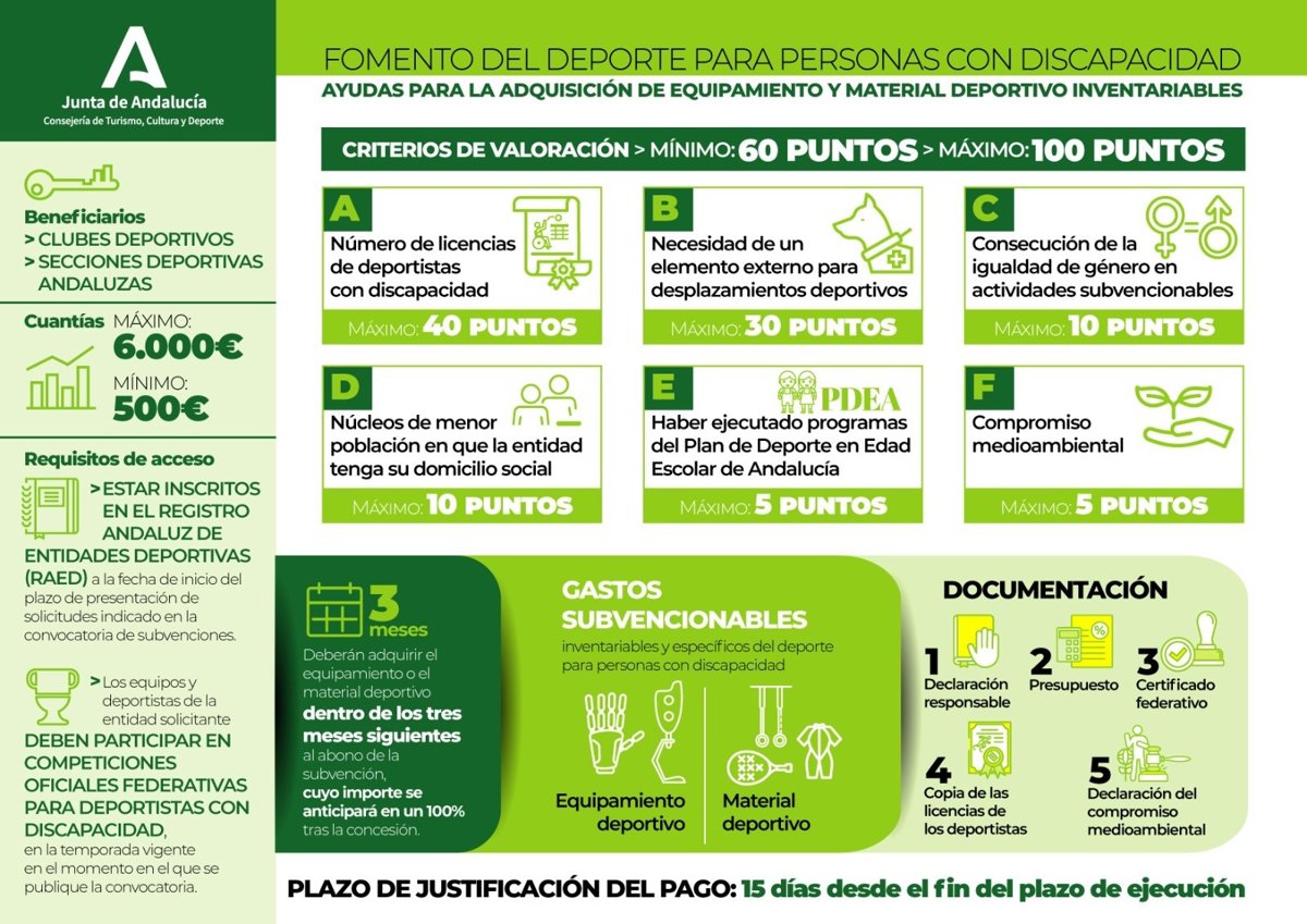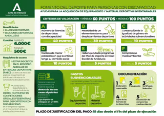 La Junta de Andalucía ha publicado una línea pionera de ayudas específicas para el fomento y la promoción de la práctica deportiva de las personas con discapacidad, destinadas a la adquisición de material y equipamiento deportivo a través de clubes y secciones deportivas inscritas en el Registro Andaluz de Entidades Deportivas (RAED).