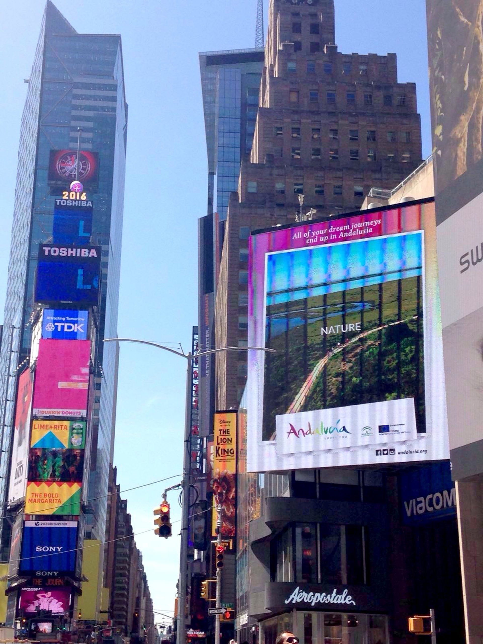 La Consejería de Turismo y Deporte ha puesto en marcha una campaña de comunicación en Nueva York que pretende difundir la imagen de Andalucía como destino turístico en enclaves emblemáticos y de elevada afluencia de público de la ciudad, como son Times Square y los ferris que unen Manhattan y Nueva Jersey.