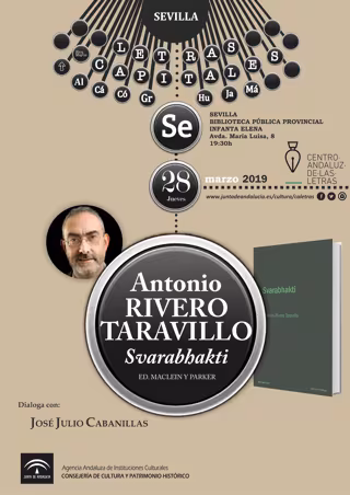 Antonio Rivero Taravillo presentará este jueves día 28 de marzo su nuevo poemario, 'Svarabhakti', en un encuentro enmarcado en el ciclo literario 'Letras Capitales', organizado por la Consejería de Cultura y Patrimonio Histórico a través del Centro Andaluz de las Letras (CAL).