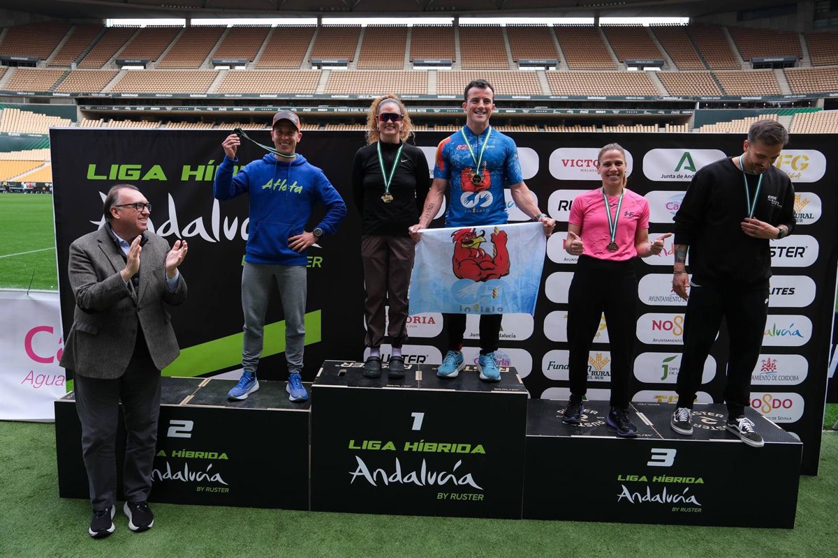 El consejero de Turismo y Andalucía Exterior de la Junta de Andalucía, Arturo Bernal, justo a los ganadores de la Liga Híbrida Andalucía. - JUNTA DE ANDALUCÍA