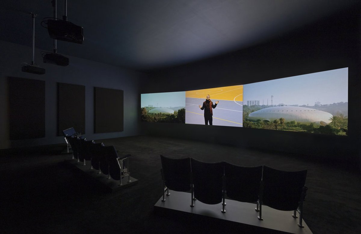 Una de las piezas más destacadas de la exposición, que se exhibe en la nave central de la antigua iglesia, es la película de tres cantales titulada Two Meetings and a Funeral, que participó en documenta 14 de Kassel en 2017 y que también ha sido exhibida en la Tate de Londres. En esta obra analiza dos proyectos políticos con cierta aspiración utópica en cuanto que intentaron romper la dinámica de bloques y por su posterior fracaso: el Movimiento de los Países No Alineados y la Organización de Cooperación Islámica, que surgieron en el complejo y multilateral panorama de la Guerra Fría y que en los años 70 tuvieron su punto de mayor actividad.