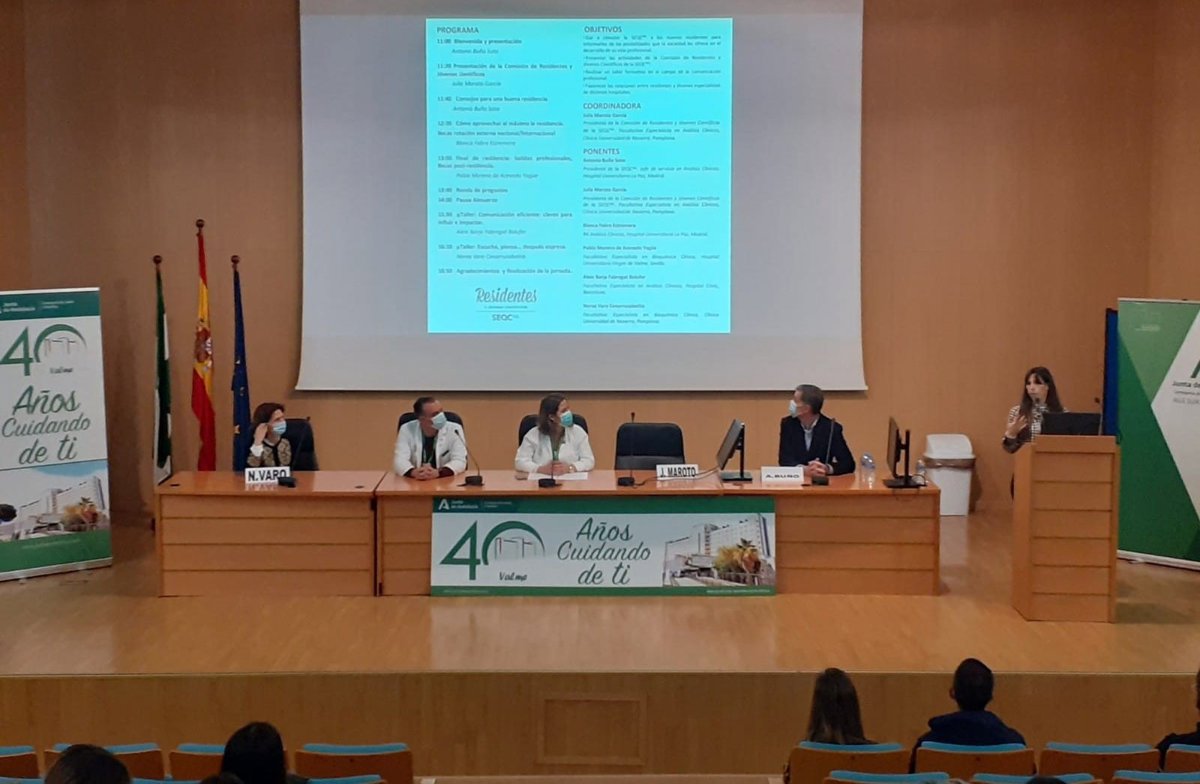 La jornada ha contado con la bienvenida de la subdirectora gerente del Área de Gestión Sanitaria Sur de Sevilla, Rocío del Castillo, y del director médico, José Antonio Sánchez, quienes han acompañado en la presentación al presidente de la Seqcml, Antonio Buño. A continuación, se han expuesto las actividades de la Comisión de Residentes y Jóvenes Científicos, ofreciendo orientación sobre cómo exprimir al máximo los cuatro años de residencia, así como qué rotaciones externas pueden realizarse y cómo conseguir financiación para las mismas.