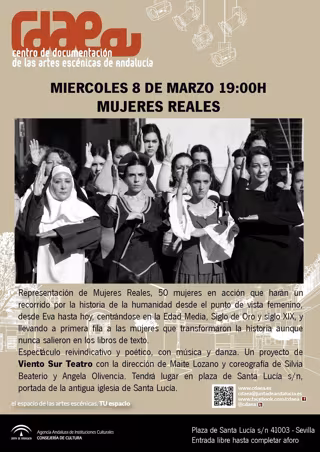 El miércoles 8 de marzo, Día Internacional de la Mujer', en la plaza de Santa Lucía (frente a la portada del Centro de Documentación de las Artes Escénicas) la compañía Viento Sur representa 'Mujeres reales', donde un grupo de 50 mujeres recorrerá la historia de la humanidad desde una visión femenina: desde Eva hasta nuestros días, centrándose en la Edad Media, Siglo de Oro y siglo XIX, y destacando a aquellas que transformaron la historia aunque nunca salieran en los libros de texto. Espectáculo de voz, música y danza con la dirección de Maite Lozano y coreografía de Silvia Beaterio y Angela Olivencia.