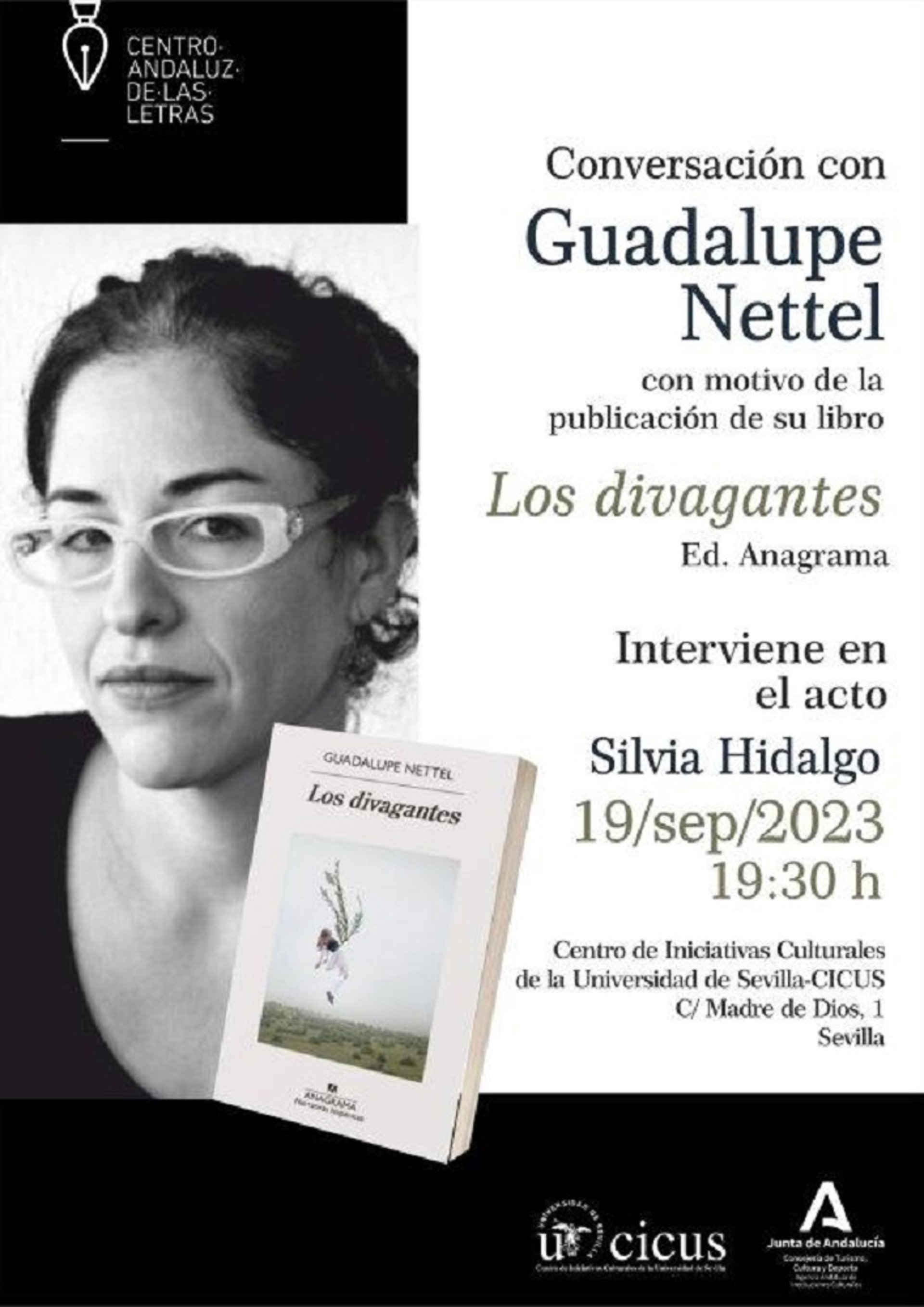 El Centro Andaluz de las Letras, de la Agencia Andaluza de Instituciones Culturales, dependiente de la Consejería de Turismo, Cultura y Deporte, organiza este martes en el Centro de Iniciativas Culturales de la Universidad de Sevilla (Cicus) la conversación entre las escritoras Guadalupe Nettel y Silvia Hidalgo con motivo de la publicación del libro de la autora mejicana 'Los divagantes'.