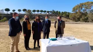 La consejera de Agricultura, Ganadería, Pesca y Desarrollo Sostenible, Carmen Crespo, ha asistido este viernes a la colocación de la primera piedra de las obras de abastecimiento en alta que se llevan a cabo en la localidad sevillana de Burguillos.