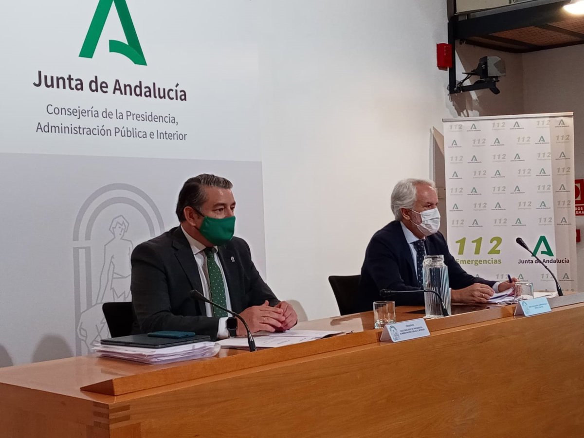El viceconsejero de la Presidencia, Antonio Sanz, y el director general de Emergencias y Protección Civil, Agustín Muñoz, este jueves durante la reunión de la Comisión de Protección Civil. - JUNTA DE ANDALUCÍA