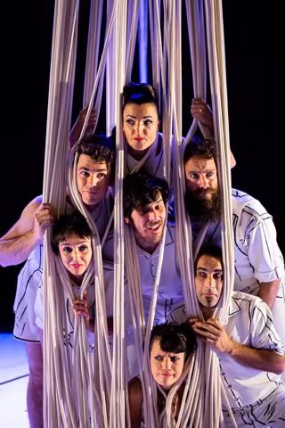 Sobre las tablas, bicicletas acrobáticas, números corales de diábolo, pelotas de rebote, portes acrobáticos, antipodismo (malabares con pies y manos) y unas multicuerdas aéreas. Todo con "un importante toque de humor y el cuidado trabajo de movimiento y coreografía de unos personajes que permanecen en escena durante todo el espectáculo".
