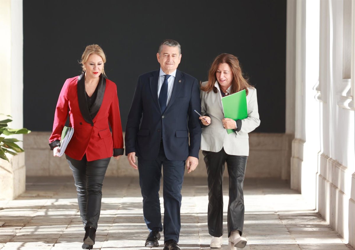 El consejero de la Presidencia, Interior, Diálogo Social y Simplificación Administrativa, Antonio Sanz; la consejera de Economía, Hacienda y Fondos Europeos y portavoz del Gobierno, CarolinaEspaña (i); y la consejera de Desarrollo Educativo y Formación - Rocío Ruz - Europa Press