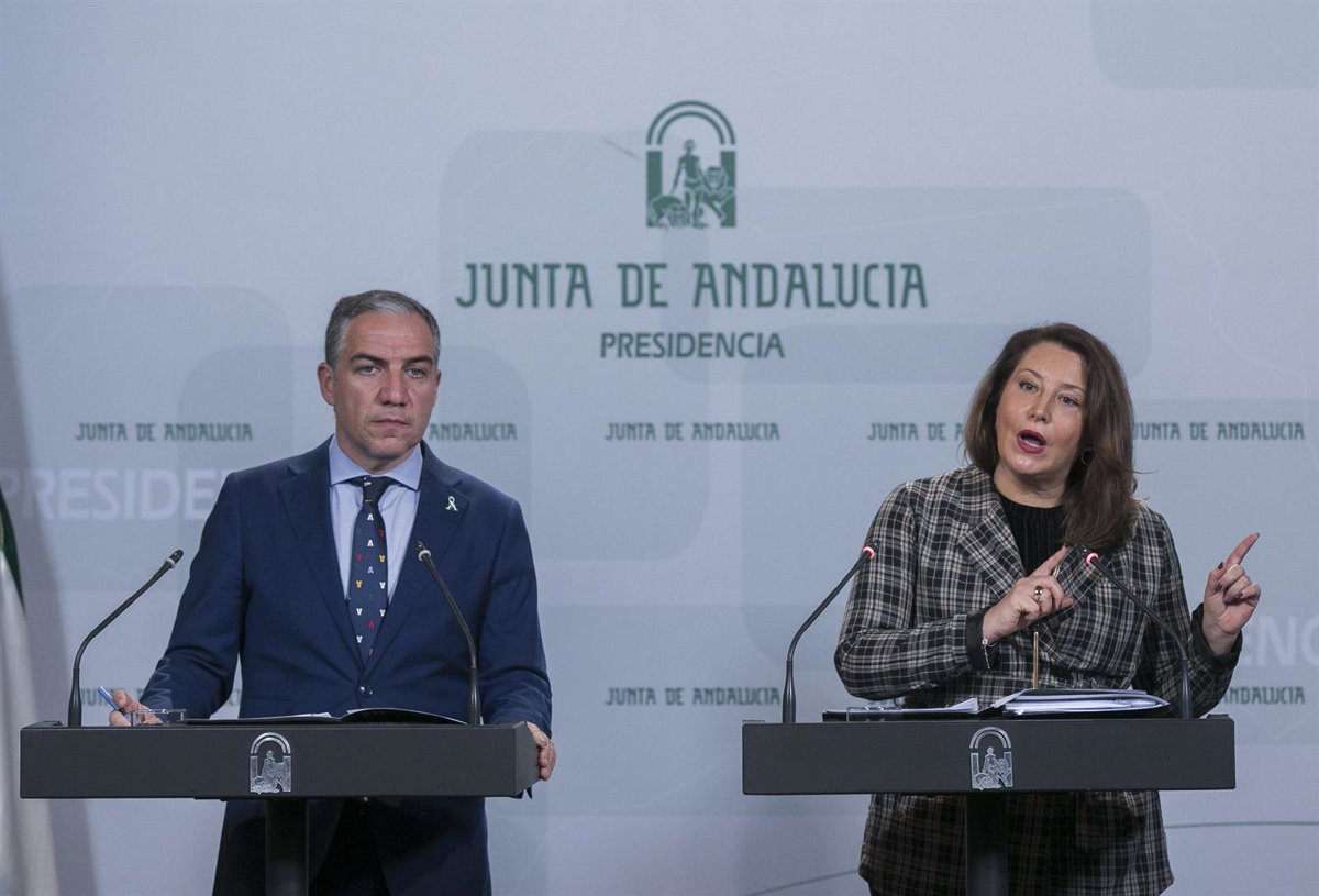 Rueda de prensa posterior al Consejo de Gobierno de Andalucía. Comparecen el Consejero de Presidencia, Elías Bendodo (i) y la consejera de Agricultura, Carmen Crespo (d). En el Palacio de San Telmo, Sevilla, a 09 enero de 2020. - María José López - Europa Press