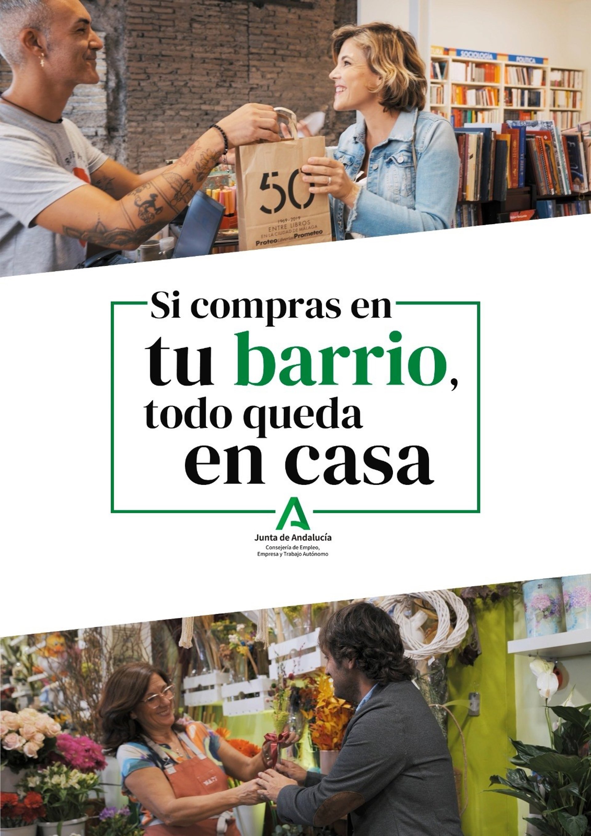 Imagen de la campaña con el lema 'Si compras en tu barrio, todo queda en casa' impulsada por la Consejería de Empleo, Empresa y Trabajo Autónomo de la Junta de Andalucía. - JUNTA DE ANDALUCÍA