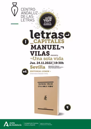 La Consejería de Turismo, Cultura y Deporte, a través de la Agencia Andaluza de Instituciones Culturales, organiza este jueves día 24 la presentación de la nueva antología de Manuel Vilas, 'Una sola vida', publicada por la editorial Lumen. El acto, que se celebrará a las 19,30 horas en la Biblioteca Pública Provincial Infanta Elena, contará con la participación del periodista Braulio Ortiz. La entrada es libre hasta completar aforo.