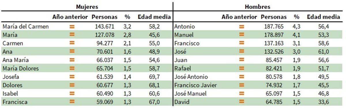 Asimismo, la lista de los diez nombres más frecuentes no presenta ningún cambio en su ordenación con respecto a la anterior edición. En cuanto a los valores, en general, se mantiene la tendencia de pérdida de población y envejecimiento de las personas que usan estos nombres. Solamente David parece ajeno a este comportamiento siendo el único nombre de este ranking que aumenta en población y con una edad media inferior a los cuarenta años.