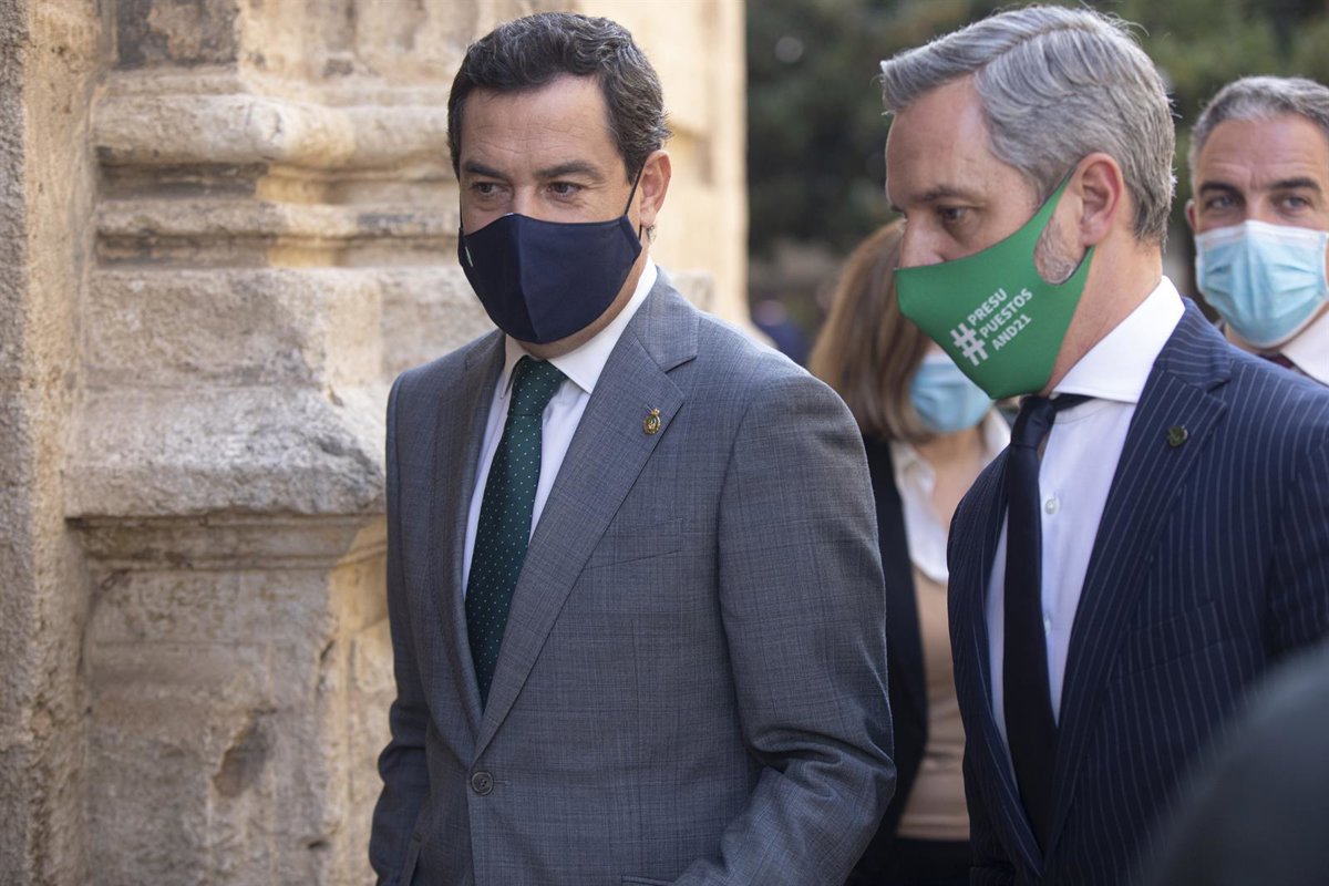 El presidente de la Junta de Andalucía, Juanma Moreno (i); junto al consejero de Hacienda y Financiación Europea, Juan Bravo (d), en una imagen de archivo. - María José López - Europa Press - Archivo