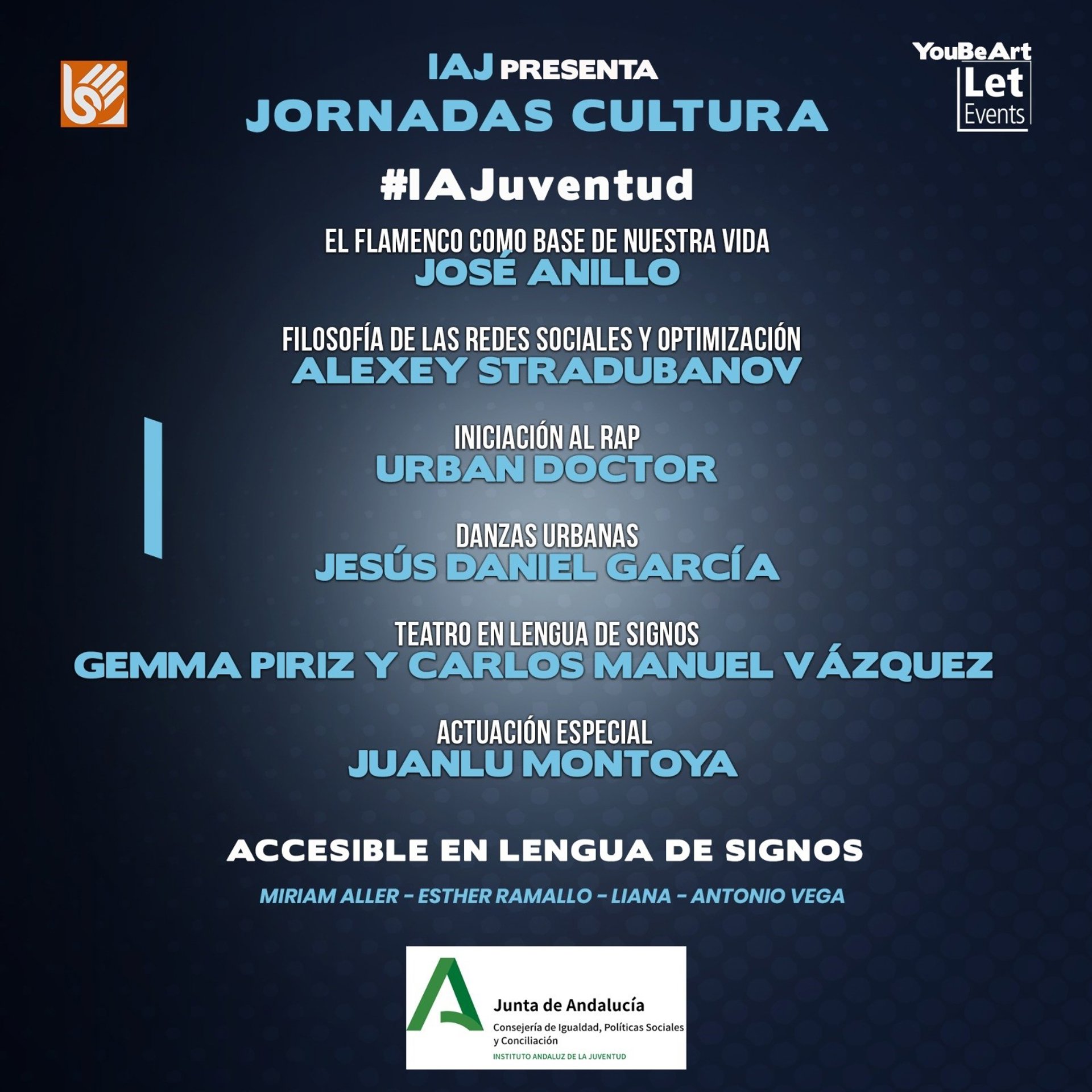 Estas jornadas culturales serán inauguradas por el director general del IAJ, David Morales, y finalizarán con un pequeño concierto del cantante y compositor sevillano Juanlu Montoya. La jornada, en su totalidad, será accesible en lengua de signos y los jóvenes que estén interesados pueden inscribirse de forma gratuita rellenando el siguiente formulario ('https://forms.gle/NsbBrffFF6rjCvj37') y podrán seguirlo a través de Facebook ('https://www.facebook.com/YouBeArtOficial/') y YouTube Live 'YouBeArt' ('https://www.youtube.com/channel/UCo-D6ABgcdJXHE1ym_MgG6Q/').