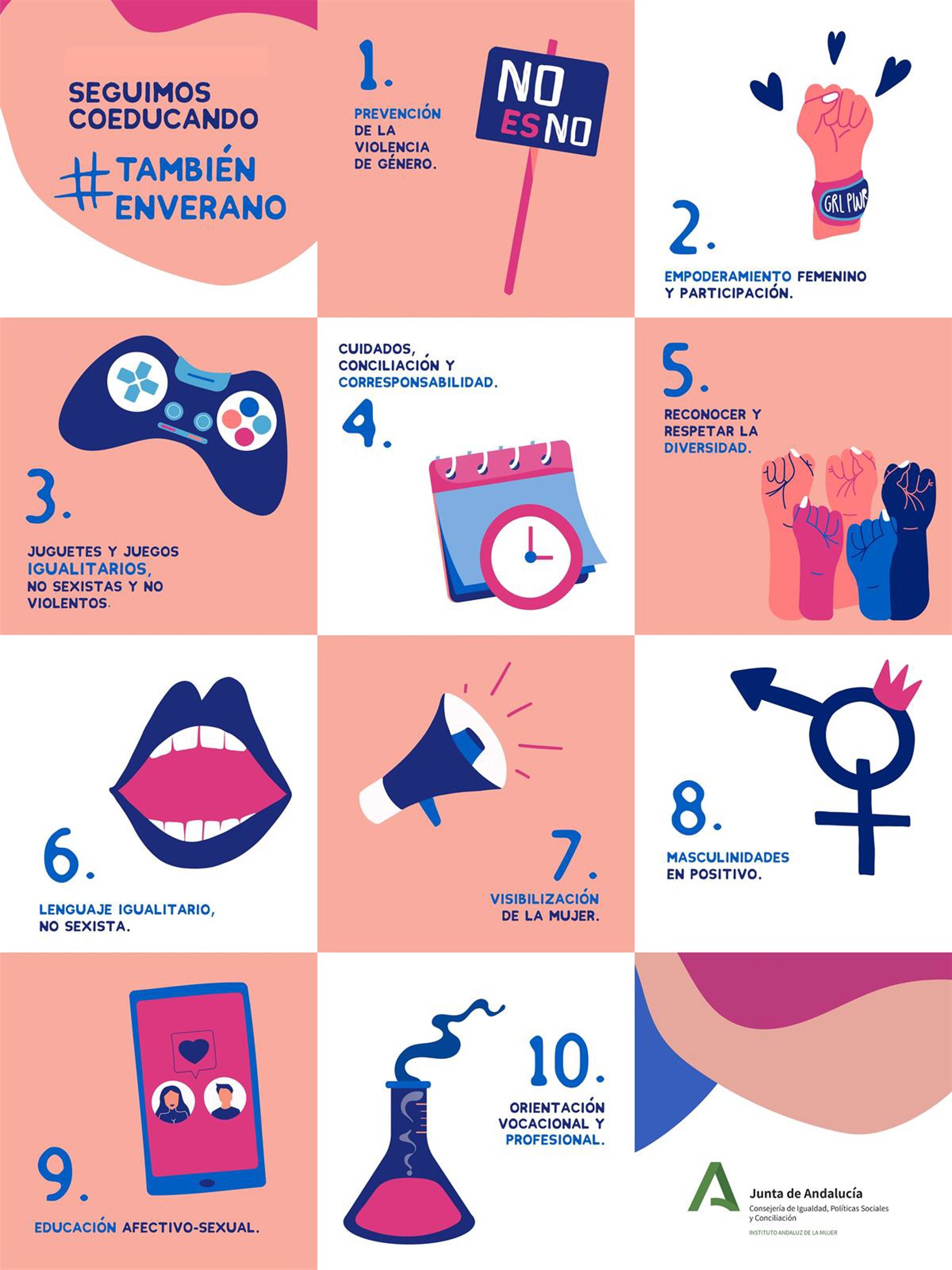 El Instituto Andaluz de la Mujer (IAM) lanza la campaña Seguimos Coeducando #TambiénEnVerano para promover la educación en igualdad durante el periodo estival. La iniciativa se materializa a través de un decálogo y diferentes piezas gráficas que se publicarán a partir de este sábado en las redes sociales del Instituto Andaluz de la Mujer: Twitter, Facebook e Instagram.
