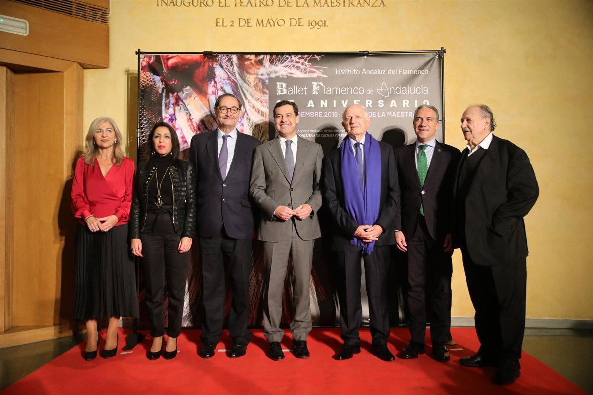 El presidente de la Junta de Andalucía, Juanma Moreno, ha asistido este martes al acto del 25 aniversario del Ballet Flamenco de Andalucía que ha tenido lugar en el Teatro de la Maestranza de Sevilla.