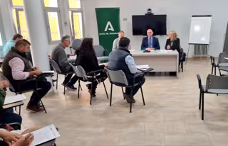El director general de la Producción Agrícola y Ganadera, Manuel Gómez, y la delegada de Agricultura, Pesca, Agua y Desarrollo Rural de Granada, Celia Santiago, se han reunido este jueves en la Oficina Comarcal Agraria (OCA) de Baza con representantes de las entidades habilitadas para tramitar estas ayudas con el fin de presentarles la Orden que recoge los detalles de las subvenciones.