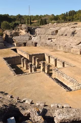 El anfiteatro romano de la ciudad de Itálica, construido en época del emperador Adriano, era uno de los más grandes del mundo romano y se encuentra fuera del recinto amurallado, aunque próximo a una de las puertas principales de la ciudad. Su eje mayor, con orientación este-oeste, coincide con una vaguada natural, que fue aprovechada para la construcción del graderío.