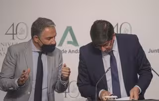El vicepresidente de la Junta de Andalucía, Juan Marín (d), junto al consejero de Presidencia, Elias Bendodo (i), en la rueda de prensa posterior a la reunión del Consejo de Gobierno de la Junta de Andalucía. En Sevilla, a 13 de octubre de 2020. - María José López - Europa Press