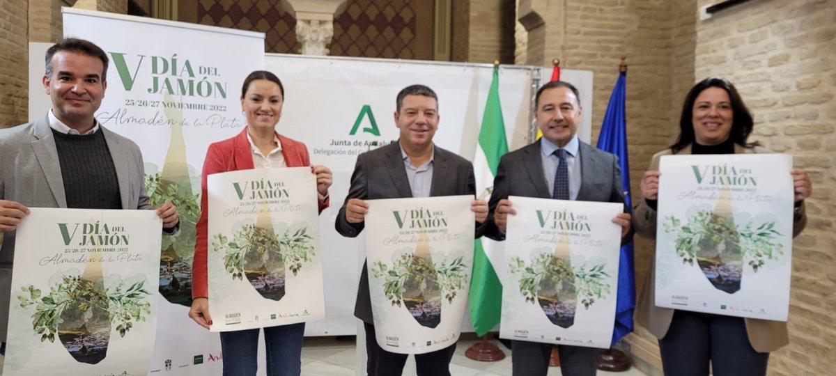 El delegado del Gobierno de la Junta de Andalucía, Ricardo Sánchez, junto al alcalde de Almadén de la Plata (Sevilla), Carlos Raigada, han presentado este jueves el cartel y las actividades programadas para el V Día del Jamón de Almadén, que se celebrará los días 25, 26 y 27 de noviembre.