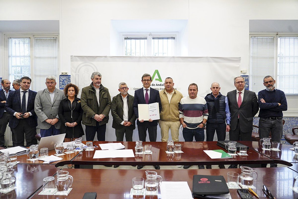 El consejero de Industria, Jorge Paradela, con representantes sindicales en la firma del nuevo convenio colectivo para Veiasa. - JUNTA DE ANDALUCIA