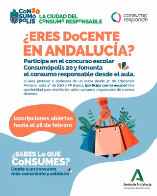 Del mismo modo, la Administración andaluza ha recordado que los equipos tienen que estar conformados por un máximo de cinco alumnos de quinto y sexto curso de Educación Primaria, de primero y segundo curso de Educación Secundaria Obligatoria (ESO), y de tercero y cuarto curso de ESO o de Formación Profesional Básica, además deben estar coordinados por un profesor, y la inscripción de cada equipo debe realizarse en la web de 'Consumópolis'. Las instrucciones generales de participación pueden consultarse en la misma web.