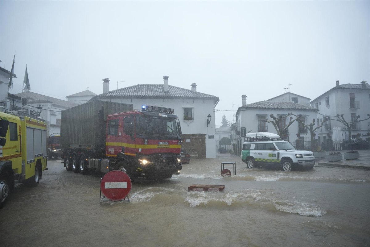 Miembros de la UME trabajan en labores de achique de agua en calles y vivendas de la localidad gaditana de Grazalema inundadas tras el paso de la borrasca Leonardo. A 4 de febrero de 2026. - Joaquín Corchero - Europa Press