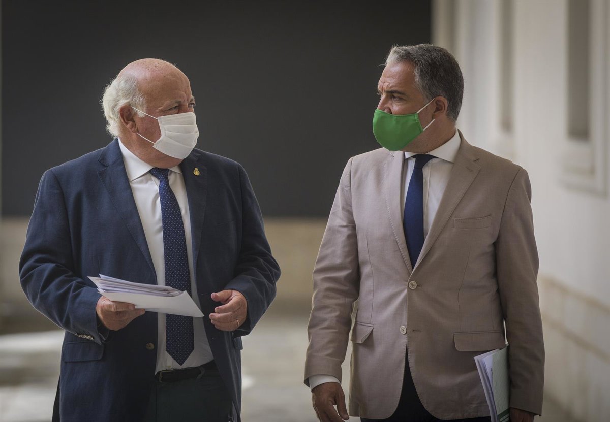 Rueda de prensa posterior a la reunión de Consejo de Gobierno de la Junta de Andalucía. Comparecen el consejero de la Presidencia, y portavoz del Gobierno, Elías Bendodo (d) y el consejero de Salud y Familias, Jesús Aguirre (i) - María José López - Europa Press