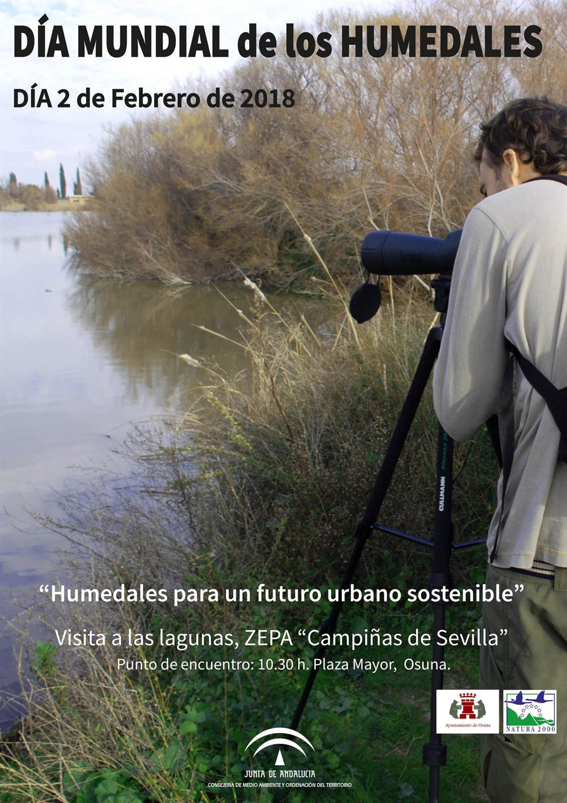 En una nota de prensa, la Delegación del Gobierno de la Junta en Sevilla ha indicado que este año el Día Mundial de los Humedales se convoca bajo el lema 'Humedales para un futuro urbano sostenible', y la Delegación Territorial de Medio Ambiente, en colaboración con el Ayuntamiento del municipio sevillano de Osuna, que se encuentra dentro del área de influencia socieconómica de la ZEPA, ha organizado una visita a las lagunas de Calderón Grande y Chica y a la laguna de La Ballestera, localizadas en este término municipal, y se observarán las aves en la laguna del Gobierno en Lantejuela.