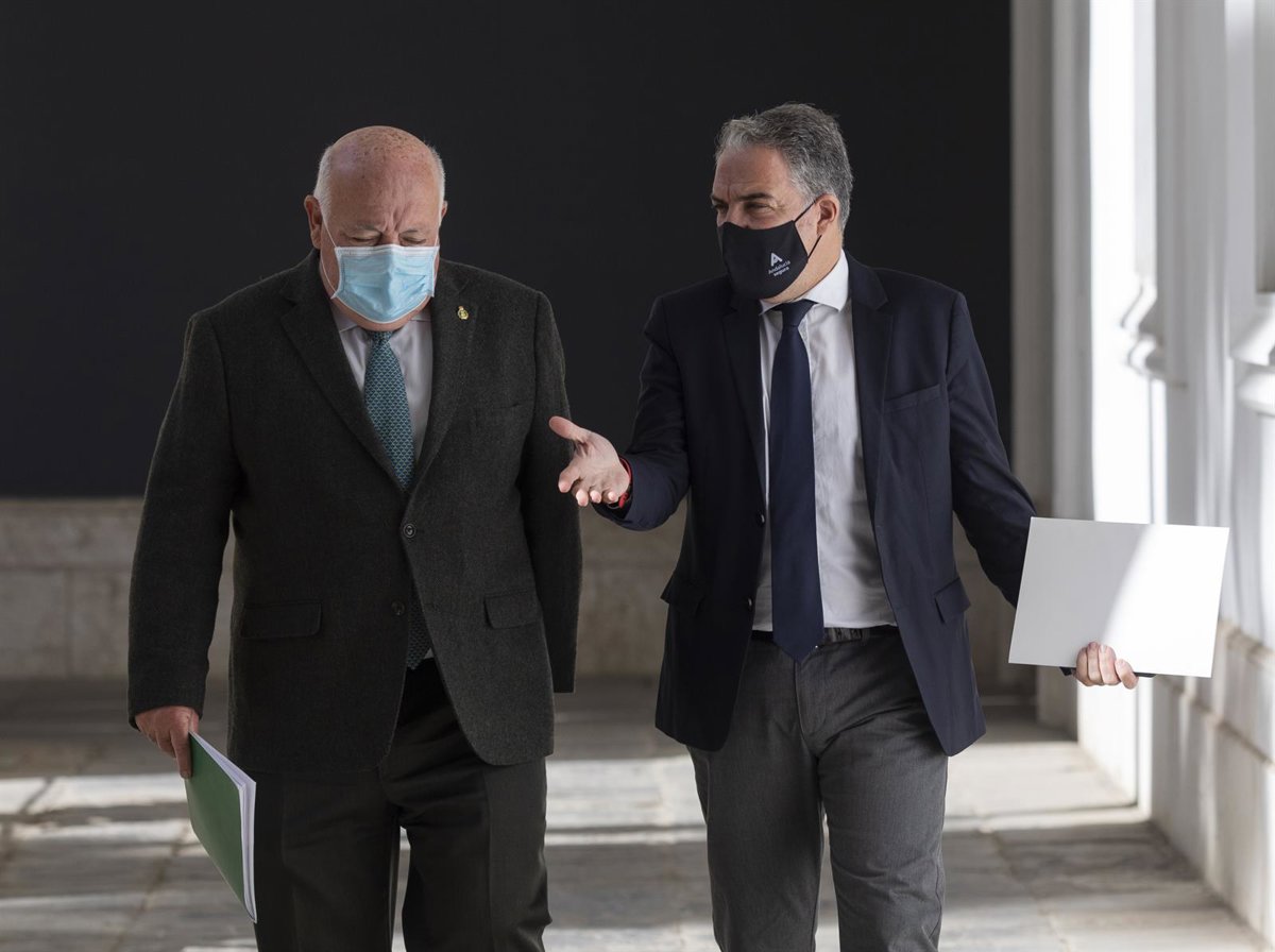 El consejero de Salud y Familias, Jesús Aguirre (i), junto al consejero de Presidencia, Elías Bendodo (d), a su llegada a la rueda de prensa tras la reunión del Consejo de Gobierno de la Junta de Andalucía. A 23 de noviembre de 2021, Sevilla (Andalucía, - María José López - Europa Press