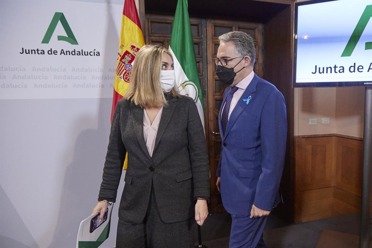 El consejero de Presidencia, Elías Bendodo, junto a la consejera de Fomento, Marifrán Carazo, durante la rueda de prensa tras el Consejo de Gobierno andaluz en el Palacio de San Telmo, a 15 de marzo de 2022 en Sevilla (Andalucía, España) - Joaquin Corchero - Europa Press